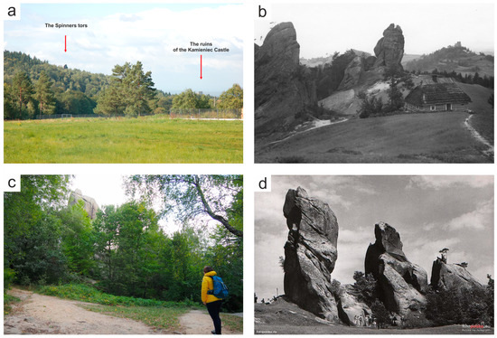 Panorama of the Prządki Nature Reserve over the last 100 years: (a) a forest-covered hill with the Prządki tors area, photo by Miśkiewicz; (b) the Herszt tors in the foreground, further the Prządka-Baba group of tors and the ruins of the Kamieniec castle in the background. Photography taken in 1918–1939 by Henryk Poddębski for the purposes of the Illustration Archive of Daily Illustrated Courier (National Digital Archives Database); (c) tors of the Prządba-Baba covered by vegetation, photo Miśkiewicz; (d) tors of the Prządka-Baba recorded in the photo from 1958–1960 made by G. Russ, PTTK (Polish Tourism and Sightseeing Society) postcard. Photographic database ”Fotopolska.eu”.