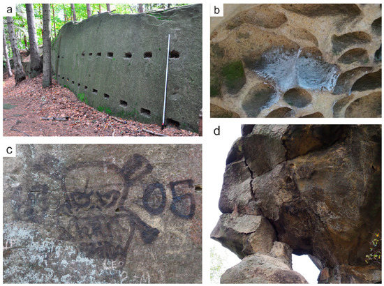 While the rock complex of greatest hardness was prepared, destructive factors such as congelifraction (frost weathering), insolation, solifluction, suffusion, corrosion, and deflation started to affect all surfaces, leading to the formation of isolated rocks, such as rock pillars (Figure 2a,b) and ridges (Figure 2c). The type of Ciężkowice Sandstone weathering, mainly granular disintegration, was determined mainly by the stone’s lithological character. The extensive niches at the bases of many rock formations were caused by the intense activity of the weathering processes mentioned above on the beds of poorly sorted and cemented conglomerate sandstone. The erosion was most intense in areas of diversified substrate resistance, such as along joint cracks. The subsequent stages of the Prządki rocks’ morphological transformation are the result of large-scale movements, e.g., rockfalls and landslides, gravitational settling, down-creeping, and bioerosion (Figure 2g)—a result of vegetation appearance [33,74].