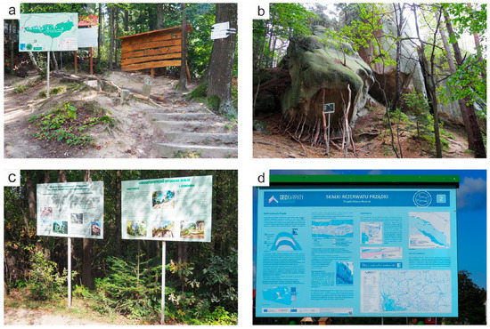 - The method of making the object available for geotourism should consider enabling tourist traffic [20,21], maintaining the presented geoheritage [2,3,4], and providing geointerpretation facilities and appropriate infrastructure that enables the acquisition of knowledge [3,4]. A willingness to learn, which motivates geotourists to be active, requires a way to make geotourism objects more accessible, so that, by exploring and using the object’s values, knowledge can be conveyed in an innovative way and keep the geoheritage unchanged [3,4]. Geotourism, understood as area management, is implemented in this way. The necessity to equip a geotourism object with interpretative and service facilities for tourists is indicated by the various definitions of geotourism (Table 1) [2,3,4]. Such equipment includes a variety of geotourism products [25,57,62], such as geotourism trails and paths, geointerpretation panels, geoeducational centers, specialized geo-guide services, geotourism events, and the use of modern multimedia solutions. The creation of such products requires an analysis of the geotourism potential of a site (or area), and making these products available to the public helps to learn and understand the numerous inextricable relationships between the geological structure of the area, its shape, the features of its biodiversity, and its current cultural values [23,31]. Links between ill-considered human interference in ecosystems and disturbances are noteworthy, often leading to natural disasters [61] such as flooding, landslides, land subsidence, lowered levels of groundwater, etc. As a result, the awareness of local communities in the field of sustainable development policy increases, with care equally directed to the environment and humans (Table 1) [23].