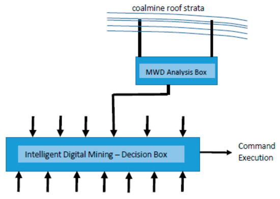 The challenges facing effective roadway design include unfavorable geotechnical conditions, lack of real-time strata monitoring, inadequate understanding of the dynamics and types of failure mechanisms, and insufficient geological data. A real-time predictive tool that can provide information on what is ahead on the drilling process while developing the roadways in underground coalmines would provide valuable data that is not currently available. The integration of the MWD concept, as shown in Figure 2, provides a high-value input into an intelligent digital mining system. The real-time geological data obtained from the drill sensors are collated and analyzed with a suitable algorithm, which is already fed into the MWD analysis box (shown in Figure 2) to characterize the strength and nature (layered or massive) of the roof strata. After the characterization of the roof strata, the roof bolting algorithm (which is a part of the intelligent digital mine but not covered in this paper) performs the calculation and optimization of the roof bolts required for adequate roof support and is passed on to the roof bolter. This whole process will be a part of the intelligent digital mining concept shown in Figure 2.