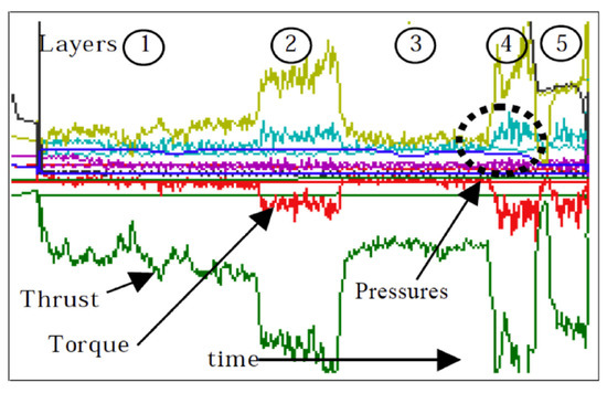 Figure 3 illustrates the distinctive combinations of drilling parameters when different strata are encountered. Generally, the specific energy of drilling (mechanical work done by drill bit per unit volume of excavated material) [11] and, recently, the rotation to thrust power ratio [7] are used to measure the energy required to fracture rocks and classify rock types. Researchers have investigated the use of the specific energy of drilling as an indicator of the uniaxial compressive strength of the samples [5].