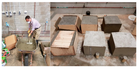First, three classes of mortar representing low, medium, and high strength geo-materials were prepared with the cement and sand mixture as shown in Table 2. Each sample was 0.4 m2 in area with a height of 0.3 m and a volume of 0.048 m3. These samples are expected to represent various strengths of the strata that are encountered in the coalmine roof. It should be noted that the strength values shown are estimates only and uniaxial compressive tests should be conducted to confirm these values. Figure 5 shows the sample preparation process at the laboratory.
