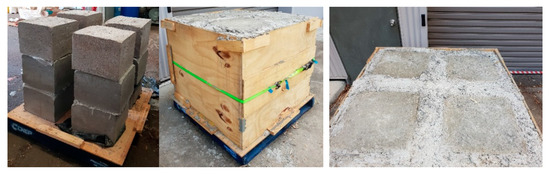 The individual samples were left and regularly watered for 35 days for curing. These samples were then assembled in a 3 by 4 matrix-type setup, shown in Figure 6, in order to form a representative geomechanical setup comprising conceptual lithological units of various strengths. These samples were cased in a large concrete structure of a dimension of 1.2 m square with a 0.9-m height as shown in the right-hand picture of Figure 6. This outer casing is needed to contain the samples firmly during the drilling process. Figure 7 shows the experimental setup.