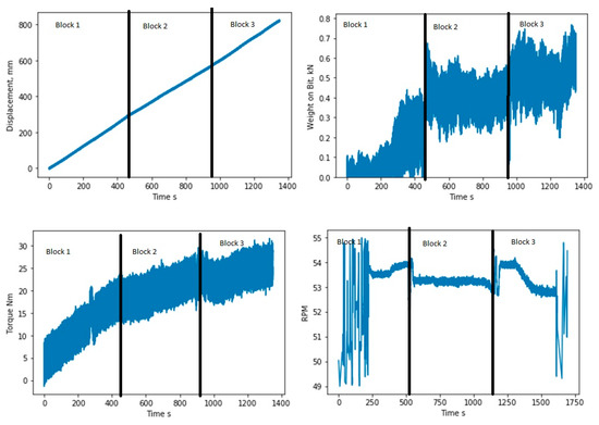 In this preliminary study, 10 holes were drilled in one column. The raw data obtained from the drill rig data acquisition system were calibrated as per the machine and sensor calibration factors. The raw data were cleaned to remove the spurious data. Then, using a suitable data processing script in the python programming language, the data were analyzed and plotted. Preliminary results while drilling a column of the blocks are shown in Figure 8. This example data is from the same drill hole. These results are promising as the various curves shown in the figure show a distinct response of the various sample blocks for the assigned drilling revolution per minute. In the displacement figure, due to the void interface, there are some kinks at around 480 and 970 s. Depending on the material the drill bit is passing through, the reaction on the weight on the bit is changing. The weaker block on the top of the drilled column does not provide much resistance to the drill bit, whereas the second block, which is stronger than the first block, provides some resistance to the drill bit. The third block is strongest of all, therefore it provided much resistance to the drill bit while drilling. A similar observation can be noted for the torque on the bit.