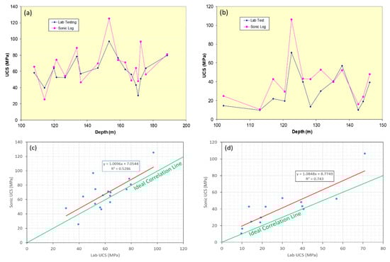 Comparison of the sonic log derived unconfined compressive strength (UCS) and the laboratory measured UCS for borehole DD0412 (a) and DD403 (b) at Southern Colliery, Australia. Plots (c) and (d) are the cross correlations of the sonic and the laboratory UCSs for DD0412 and DD403, respectively.