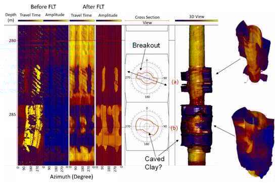 Another application of the acoustic scanner data is the determination of breakouts and in-situ stress (direction and magnitude). The principle of stress determination from borehole breakouts can be found in references [25,26]. The breakouts occur due to overstressing of the borehole wall. Borehole breakout, depending on the in-situ stress magnitude, rock strength, drilling mud weight and pore pressure, is a shear failure in the direction of the minimum horizontal (minor) stress and can be used as a high-quality indicator of stress direction. In addition, we can also estimate the stress magnitude using the Kirsch solution based on the rock strength, breakout angle and depth, pore pressure and drilling mud pressure.