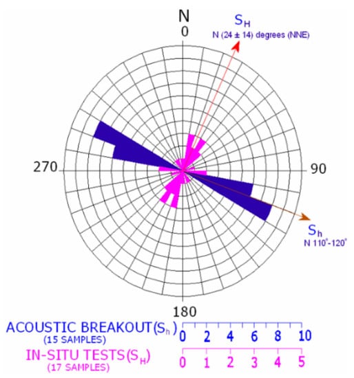 A comparison of the minor and major stress directions determined from the acoustic scanner breakout analysis and the in-situ hydrofracturing stress tests, respectively. These two independently determined directions are orthogonal, which supports each other independently. The hydrofracturing tests were performed at Adriyala Mine, India.