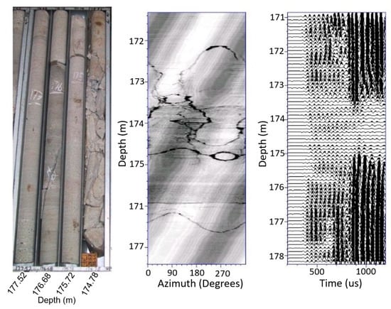 Core photograph (left), acoustic scanner log (middle) and full waveform sonic log (right) from the same section of a cored borehole from the Illawarra area, New South Wales, Australia.