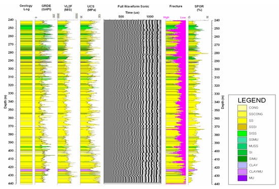 In addition to the conventional sonic logs, both full waveform sonic (FWS) and acoustic televiewer scanner images provide rich information regarding the rock strength. Acoustic teleview scanner data measure two parameters—the two-way interval transit time from the transducer to the borehole wall; and the reflected amplitude of the signal from the borehole wall. The recorded scanner amplitude measures the contrast of the acoustic impedance (the product of velocity and density) between the drilling mud and borehole wall and indicates the variation of the rock strength and rock unit boundaries. In addition, the low-amplitudes are normally associated with fractures. The usefulness of the acoustic scanner data can be easily demonstrated by the scanner amplitude image from Kakatiya Khani Coal Mine (India) borehole KTK736 in Figure 2. From this plot, we can qualitatively identify the strong (yellow), moderately strong (light brown), weak (dark-brown) and very weak (dark blue) rock units. From this, we can easily interpret the major bedding planes. We also recognize fractures and joints in the coal seams. Note that the coal has relatively high strength, similar to the weak rock units, which is consistent with the actual lab tests.