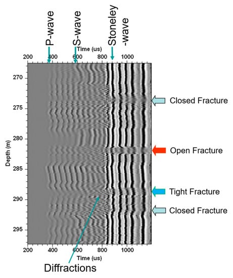Based on the above observation, a fracture indicator can be derived from the total energy of the FWS as shown in Figure 6 (shaded in magenta). In general, fractures are associated with the Stoneley wave energy loss and diffraction patterns as shown in Figure 5 and Figure 7. Based on the amount of energy loss and the diffraction patterns, one may classify the possible fractures as open fractures (Loss most of the Stoneley wave energy); closed fractures (there no much Stoneley wave energy loss but the diffraction patterns can be observed); and the tight fractures (between the open and close fractures), as illustrated in Figure 7. However, energy loss can be caused by permeable strata such as coal seam and the diffractions can also be caused by strata interfaces. Without further information to support, the fracture interpretation from the FWS data can only considered as a fracture indicator or more accurately, it should be considered as a permeability indicator. Table 1 presents the fractures interpreted from the FWS data in Figure 6.