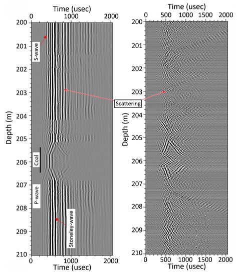 Full-waveform sonic data showing P-wave, S-wave, Stoneley wave and scattering. The left plot is the original data from receiver 1 from Kakatiya borehole KK736 while the right plot is the enhanced scattering waves after filtering out the P-, S- and Stoneley waves by a 7-point vertical averaging filter.