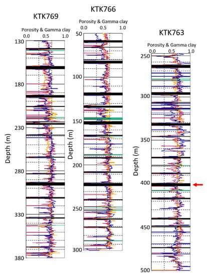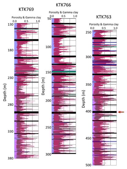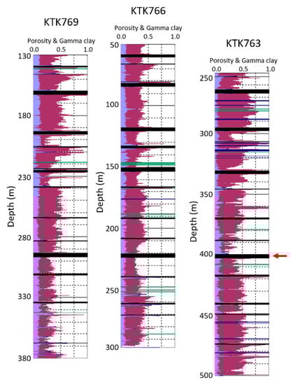 The estimated porosity (light blue) from density and clay (maroon) from resistivity for the KTK boreholes 769, 766 and 763. The arrow indicates the same seam lined up. The blue bands indicate dense materials such as siderite and basalts while the green bands are volcanic tuff bands.