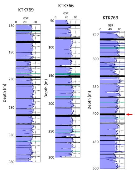 The estimated geophysical strata rating (GSR) for the KTK boreholes 769, 766 and 763. The blue bands indicate dense materials such as siderite and basalts while the green bands are volcanic tuff bands.