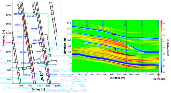 Sonic velocity distribution (right) along the tailgate (the red line on the left plot). The cross section was cut out from the 3D sonic velocity model; interpolated using coal seams (GM, PL, PU and GU) constrained interpolation of sonic logs from 12 boreholes along the maingate and tailgate at the Moranbah Mine. The strong sandy units correlate with high velocity.