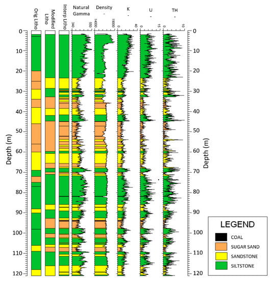 The strength of the rock is usually related to the rock type—well cemented sandstones are stronger than mudstones, claystone and siltstone. Therefore, lithological interpretation of geophysical logs and its spatial distribution of lithologies will greatly improve our understanding of the effects of overburden sediments in relation to the coal mining activities. The prediction of lithology from conventional geophysical logs is well established and automatic geophysical interpretation programs such as LogTrans have been developed [5]. This is an effective tool for lithological classification [33]. At Callide Mine, Queensland, Australia, rock type mapping is very important before blast planning, especially for that of the poorly cemented sandstone. This is a rock layer locally referred to as sugar sands, which are largely quartz sand that are very strong when dry but behave like sand if wet. To enable mapping these sugar sands, Callide has collected various geophysical logs including SIROLOG spectrometric natural gamma logging data. From this, the natural (total) gamma, the density, the components of total natural gamma and thorium (Th), potassium (K) and uranium (U) content can be derived. These parameters have strong correlations with the rock type and would be valuable for lithology prediction. To evaluate the potential of SIROLOG data for identification of sugar sand presence, we carried out a preliminary study with limited data from a borehole using LogTrans. The results were very encouraging and the SIROLOG interpreted rock classes including the sugar sands were well matched with the original geological logs as shown in Figure 14. It is clear that SIROLOG data can assist with recognition of sugar sands at Callide.