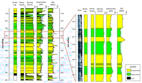 Geotechnical assessments such as rock strength estimation and rock mass characterization are the most attractive applications of geophysical logs as it is critically important to have a proper understanding and accurate estimation of the strength and characteristics of the various rock types present for coal mine design and production. Rock strength properties are often affected by, for example, porosity, mineral bonding type, quality of the solid particles, the internal structure of the rock skeleton and water content [16]. The complexity of rock strength influences and dependencies makes the estimation of rock strength difficult. Rock strength can be determined in various ways but most approaches require an understanding of the properties of the intact rock and of the defects within it. Geophysical logs can be used to estimate both of these properties, which will be illustrated in this section.