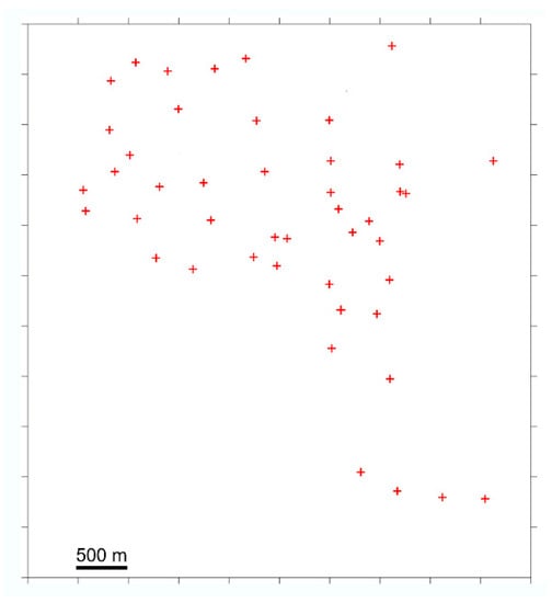 The merits of coal quality parameter estimations using multiple geophysical logs have been demonstrated by Zhou and Esterle [37] and Zhou and O’Brien [7]. Here we will use another example from a mine in New South Wales, Australia, to illustrate the method’s performance. Both geophysical logging and laboratory coal quality proximate analysis data were provided by the mine. There are 1316 coal samples from 39 boreholes. The coal samples are from different seams with variable thickness. The 39 boreholes are distributed from an area of about 5 km × 6.5 km (as shown in Figure 16). The key coal quality parameters provided are air-dry basis relative density RDad, ash content ASHad, fixed carbon FCad, inherent moisture Imad, crucible swelling number CSN, specific energy SEad and volatile matters VMad. The key geophysical logs are GRDE, DENB, DENL, DEPO, MC2F, MC4F, RPOR and GRNP. In these logs, GRDE and GRNP are gamma ray logs from density and neutron loggings, respectively, reflecting the lithology of the coal; DENB and DENL are short- and long-spaced density logs, which have strong correlation with coal ash content; DEPO and RPOR are sandstone-calibrated porosities derived from density and neutron logs; and MC2F and MC4F are 20 cm-spaced and 40 cm-spaced sonic logs, signifying the integrity and the strength of the coal samples.
