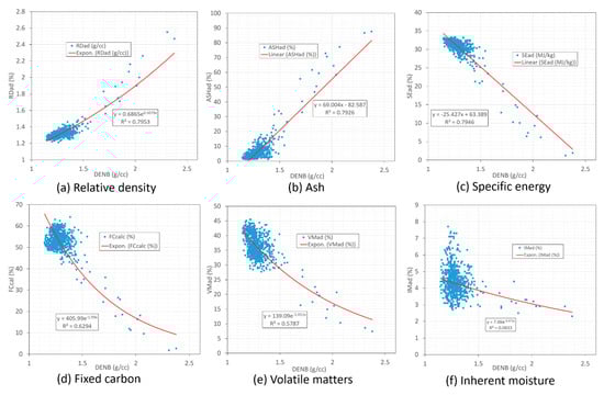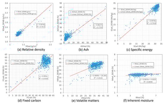 The cross-plots of the laboratory coal quality parameters with the corresponding coal quality parameters estimated from geophysical density log DENB: (a) relative density, (b) ash, (c) specific energy, (d) fixed carbon, (e) volatile matters and (f) inherent moisture.