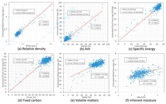 The cross-plots of the laboratory coal quality parameters with the corresponding coal quality parameters estimated from multi geophysical logs: FROM, GRDE, DENB, DEPO & RPOR: (a) relative density, (b) ash, (c) specific energy, (d) fixed carbon, (e) volatile matters and (f) inherent moisture..