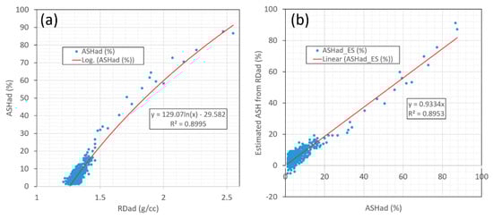 Please note that the relative error of the ash estimation from the multi geophysical logs is 52.2% despite the average absolute error being only 2.48%. The reason is that the majority of the coal samples are from 1–20% (low ash) and the average ash value is only 6.56%. This makes the relative error of the ash estimation high. To verify the above statements, we produced a cross-correlation of the laboratory ASHad and RDad data (Figure 20a) to estimate the ASHad, which is the best correlation for ASHad that can be derived. The estimated ash from RDad are presented in Figure 20b. The estimated relative average error is 59.97% even with a correlation coefficient of 0.95. This suggests that a high relative estimated error for ash is inherited from the low ash contents at this mine.