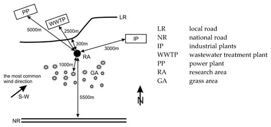 The area within a 3 km radius of the sampling site is characterized by low emission of dust pollution due to the lack of industrial and organic plants; an exception occurs in the summer period, during which dust formation is associated with mowing grass. The nearest transport route is a county road with limited traffic intensity (0.3 km from the sampling site) and a national road (5.5 km away in the southerly direction). The area in which sampling was conducted is overgrown with low shrubs and grasses, and the nearest trees and agricultural fields are located approximately 1 km to the west of the housing. A water treatment plant (2.5 km) and the power plant Załęże (approx. 5 km) are located to the northwest of the sampling site. Westerly and southwesterly winds prevailed during the study period (Figure 2).
