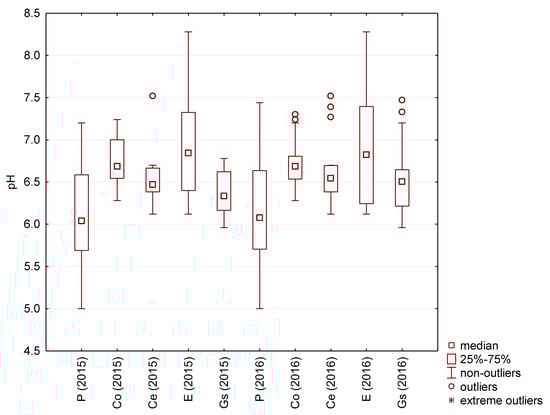Electrical conductivity is an indicator of positive or negative ions present in the water. It may indicate pollution by substances such as heavy metal ions. In the analyzed water samples, the electrical conductivity was around 1–4 μS/cm (median). Zhang et al. obtained similar results for water collected from roofs covered with roof tiles and sheets, and a significantly higher conductivity was determined for runoffs from the green roof []. The general mineralization of rainwater in natural conditions may be only several milligrams of the substance dissolved per liter of water; however, in industrialized regions, the mineralization level is increased. The values obtained are relatively low in comparison with those recorded in industrialized zones (614.8 μS/cm) [].
