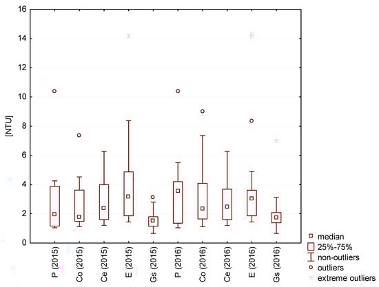 In turn, water that was characterized by the highest turbidity (max. 14 NTU) was collected from the surface coated with epoxy resin, and the lowest turbidity was found in rainwater collected from the zinc-coated metal sheet (medians of 1.5 and 2.0 NTU in 2015 and 2016) (Figure 4).