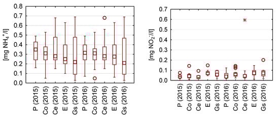 The median values of ammoniacal nitrogen concentrations were found to range from 0.20 to 0.35 mg NH4+/L (0.16–0.27 mg N/L). Extreme values were obtained for rainwater collected from the galvanized steel sheet roof and the rainwater collected directly from precipitation.