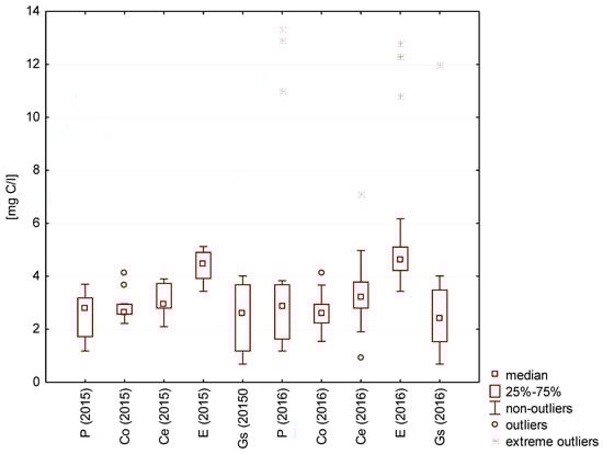 Total organic carbon (TOC) is a parameter that describes the level of water pollution by organic matter. The highest median TOC values were identified for rainwater from the surface covered with epoxide coating (5 mg C/L) (Figure 6).