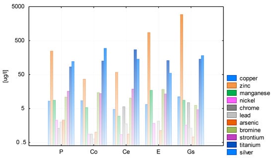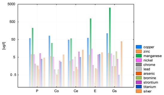 The results of the analysis of heavy metal ions in both test cycles are displayed in Figure 5 and Figure 6. Each tested water sample appeared to contain trace amounts of nickel, chromium, lead, and arsenic at concentrations slightly above 1 µg/L; ions of copper, manganese, bromine, and strontium were measured at levels of around 10 µg/L, and the concentrations of iron, zinc, titanium, and silver often exceeded 100 µg/L.