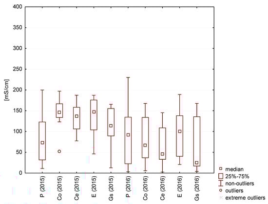 The lowest electrical conductivity values were recorded for water collected from the guttering of a roof covered with the galvanized steel sheet (comparable to the values for control samples collected directly from atmospheric precipitation). The type of rainwater with the highest electrical conductivity was not clearly indicated (Figure 9).