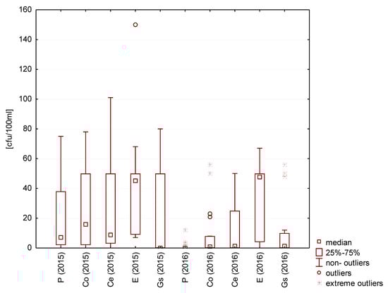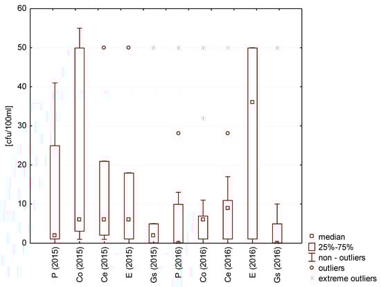 E. coli were the most numerous in rainwater collected from concrete tile roofing during the test seasons in 2015 and in terrace-collected rainwater in 2016. The lowest number of E. coli (excluding the lowest and highest outliers) was measured in the rainwater collected from galvanized steel sheet roofing (less than 5 cfu/100 mL). In this rainwater, the number of bacteria was similar in both test cycles. However, the number of Enterococcus in rainwater collected directly from atmospheric precipitation and from roofs with concrete and ceramic tiles and the galvanized steel sheet was lower in 2016 than in 2015. The values were similar in both test cycles only for the rainwater from the surface covered with epoxide coating (Figure 11).