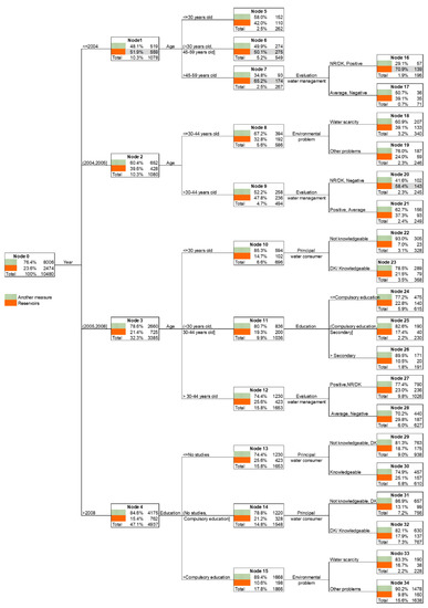 In order to identify the characteristics of the population groups that are in favor of reservoir construction, we have carried out a hierarchical segmentation analysis, using the Chi-squared Automatic Interaction Detection (CHAID) algorithm. This technique is applied to qualitative variables, and using the chi-square test of independence (based on the associated p-value and the Bonferroni correction) in the distinct phases of the segmentation process: grouping of independent variable categories; comparison of effects between different variables; and, finalization of the segmentation process [61]. In the first phase, the variable which best differentiates participants in relation to the given dependent variable is selected, thus creating homogenous groups representing a similar opinion. Those groups form the nucleus of the new divisions, and therefore the variables which discriminate most effectively, will determine the inclusion of the next variables in the process. The end result is presented in a tree diagram, where each ‘node’ shows the variable from which the cluster originates; each branch indicates the category which defines the subgroup and its size; and within each rectangle, the percentage distribution of the dependent variable is noted—in this case reflecting the preference for the construction of reservoirs, or other water management measures, respectively. The SPSS version 26.0 statistical package was used.