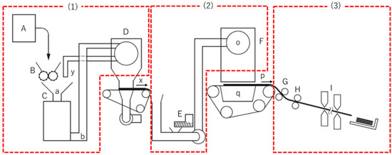 Dry-type used paper recycling technology process diagram ((1) Defibration process, (2) Binding process, (3) Forming process); (A) Paper feeding section, (B) Shredding section, (C) Defibration section, (D) Selection section, (E) Mixing section, (F) Binding section, (G) Pressurization section, (H) Heating section, (I) Cutting section, (a) Insertion section, (b) Discharge section, (o) Rotating sieve, (p) Mesh belt, (q) Suction mechanism, (x) Following process path, (y) Return path.