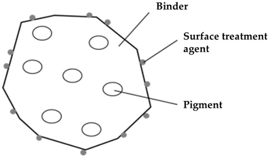 As detailed above, a bonding agent is used to bind paper fibers together, thus creating the paper. The bonding agent is a powder mainly consisting of a thermoplastic resin. For its structure, the binder contains pigments, with a surface treatment agent applied to the exterior surface of the powder (Figure 5). Its composition is shown in Table 3.