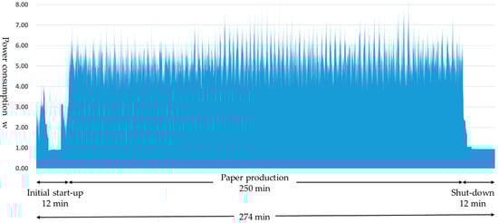 Figure 7 shows an example of the power consumption at the paper-making stage. Both start-up and shut-down take approximately 12 min, consuming a total of 0.74 kWh electricity. In total, 250 min of paper production produces 3040 sheets, consuming 21.75 kWh of electricity. As shown in Figure 7, variances in the power consumption in paper production are because of differences in the quantities of paper fed into the defibration section as well as in the quantities of materials returned from the selection section (separator drum unit) to the defibration section. From this, we can see that this series of processes consume a total of 22.49 kWh of electricity. Power consumption per sheet of paper is 7.40 Wh. Furthermore, these measurements were repeated three times, confirming their reproducibility (1st time: 22.50 kWh, 2nd time: 21.97 kWh, 3rd time: 22.62 kWh). The weight of DFP manufactured using this technology is 5.7 g per sheet, giving a power consumption of 1298.25 kWh (7.40 Wh/5.70 g × 1,000,000.00 g) per ton as the functional unit.