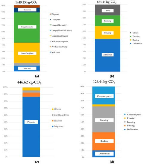 Finally, Figure 8d shows a breakdown of the CO2 emissions in the production stage. By process, this is defibration (9.7%), binding (25.7%), and forming (36.7%), with forming comprising the largest proportion. The reason that the forming process has the highest ratio is the large sizes of the pressurization and heating units used during manufacturing, with a corresponding large environmental burden from the procurement of these materials.
