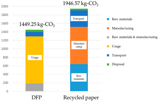 Next, the results from this study were compared with the case of recycled paper (Figure 9). To calculate the CO2 emissions for recycled paper, CO2 emissions until production used data from the Japan Paper Association [27], and emissions from transport and sales used data from Environmental Hotspot Analysis (EHSA) [28]. It was shown that utilization of the dry-type paper recycling technology enabled a total reduction of 500 kg, or 26% in CO2 emissions. In particular, this technology produced reductions in the environmental burden up until the procurement of pulp, and in the delivery and sales of the product. However, CO2 emissions through the use of this technology in the production stage of DFP were comparatively high. Therefore, as shown previously, further study is required in how to reduce the environmental burden by reducing power consumption and the amount of bonding agent used.