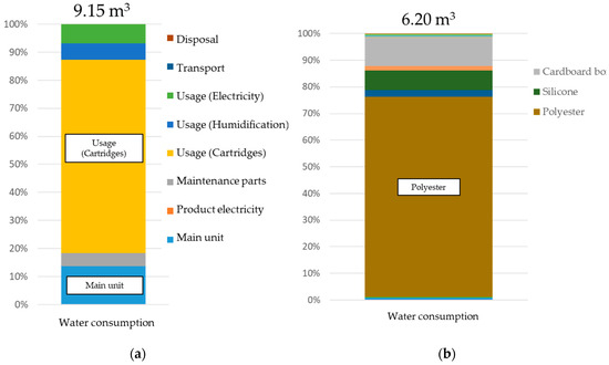 In addition to CO2 emissions, this study also focused on water consumption. Figure 10a shows the water consumption results when using this technology. Water consumption per ton of product is approximately 9 m3, and as with CO2 emissions, the usage stage was responsible for more than half of the total. However, the production of cartridges had high water consumption, rather than power consumption. Figure 10b shows a breakdown of the water consumption focusing on cartridges. As with CO2 emissions, there was high water consumption (approximately 75%) until the production of materials with polyester as a main ingredient, with packaging and external additives around 10% each.