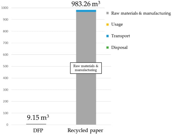We compared the results above with existing studies (Figure 11). This comparison used data from the Japan Paper Association [27] and the Water Footprint Network (WFN) [22]. The WFN [22] has results for three types of printing paper (broadleaf, softwood, and eucalyptus), but as Japan mainly uses domestic and imported broadleaf, this study used the figures for broadleaf. Water consumption for the production of 1 ton of paper comes to 965 m3. The water consumption from the distribution of PPC paper from Ono et al. [24] was added to this, giving a total of 983 m3. Compared to the water consumption for PPC paper, that for producing 1 ton of DFP was approximately 9.15 m3, roughly 1% of that for PPC paper. The reason for this is that printing paper requires large amounts of rainwater in order to grow wood and to produce pulp, whereas DFP reduces the consumption of virgin pulp. Furthermore, because it uses a dry-type production process, the water used during the production process is also significantly reduced. There is high water consumption during the production stage of wood and pulp, which comprise the raw materials used to make paper as well as during the paper-making stage, but this technology obviates the need for this production, thus limiting water consumption during the paper-making stage.