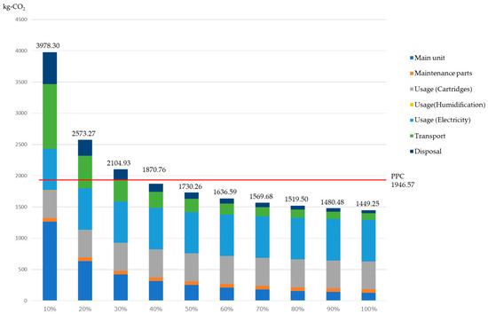 This section evaluates the sensitivity of CO2 emissions to variances in the product utilization rate. With 100% utilization set at 8 h per day, we ran simulations at between 10% to 100%, with results of the comparisons of CO2 emissions for the manufacture of recycled paper (Japan Paper Association) shown in Figure 12. The lowest CO2 emissions were obtained for the 100% utilization rate scenario, at 1449 kg-CO2, whereas emissions for the 10% scenario were 2.8 times higher, at 3975 kg-CO2. A breakdown of CO2 emissions shows the environmental burden from cartridges as 31% and that of electrical power usage as 46% in the 100% utilization rate scenario, comprising approximately 80% of the total emissions in the usage stage. On the other hand, in the 10% utilization rate scenario, the manufacture of the main unit comprised 32%, transport 26%, and disposal 13%, with emissions in other than the usage stage comprising more than half of the total.
