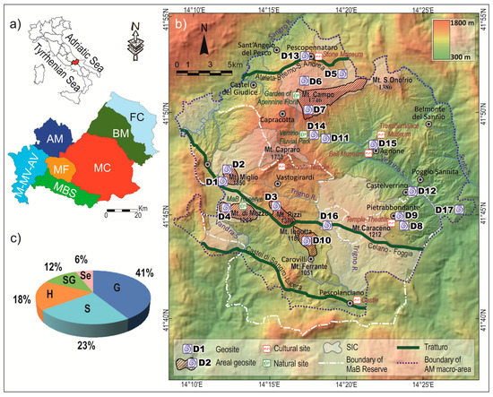 (a) The Molise region and its subdivision in seven macro-areas. M-MV-AV = Mainarde-Monti di Venafro-Alto Volturno, MBS = Matese-Conca di Boiano-Sepino, MF = Montagnola di Frosolone, AM = Alto Molise, MC = Molise Centrale, BM = Basso Molise, FC = Fascia Costiera; (b) Altitude and drainage network map of the Alto Molise macro-area with the location of the 17 assessed geosites and the other sites of interest; (c) Pie chart illustrating the assessed types of geosites and related percentages, based on primary scientific interests (G = Geomorphology, S = Stratigraphy, SG = Structural Geology, Se = Sedimentology, H = Hydrogeology).