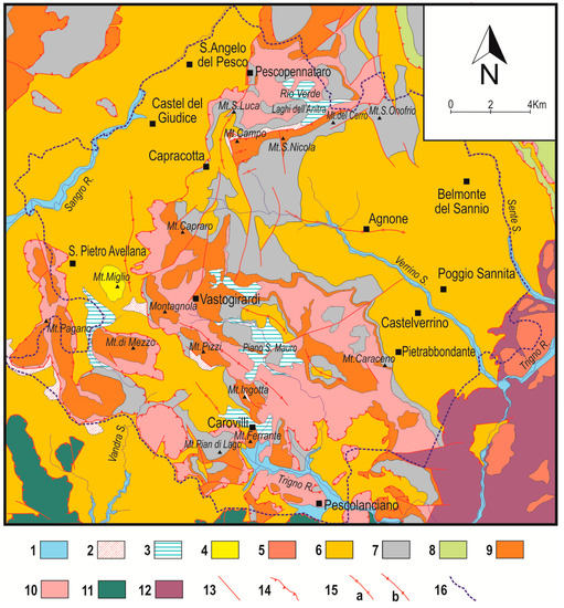 Geological sketch map of the Alto Molise area (modified from Vezzani et al. [62]). (1) Fluvial deposits (Holocene), (2) Slope debris (Late Pleistocene-Holocene), (3) Fluvial-palustrine deposits (Late Pleistocene-Holocene), (4) Limestones and polygenic conglomerates (Early-Middle Pliocene), (5) Siliciclastic deposits (S. Bartolomeo Flysch, Middle-Late Miocene), (6) Siliciclastic deposits (Agnone Flysch, Late Miocene); (7) Clayey marls and limestones (Marne ad Orbulina Formation, Late Miocene), (8) Marly limestones, marls and limestones (Tufillo Formation, Middle–Late Miocene), (9) Limestones and marls (Gamberale-Pizzoferrato Formation, Middle Miocene), (10) Varicolored clays and marls (Oligocene-Early Miocene), (11) Limestones and marly limestones (Frosolone Units, Late Cretaceous–Late Miocene), (12) Clays, marly clays and limestones (Sannio Units, Late Cretaceous–Early Miocene), (13) main faults, (14) main thrusts, (15) folds: a. syncline, b. anticline, 16) boundary of the Alto Molise macro-area.