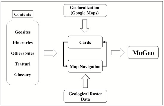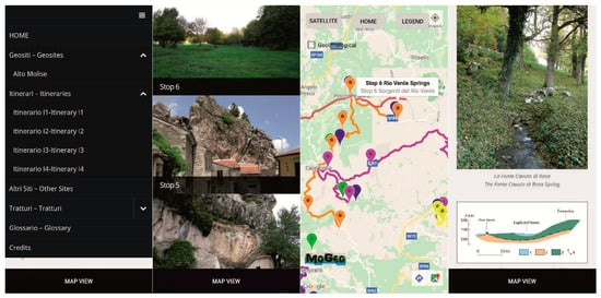 The choice of other contents (Figure 3) to be included in MoGeo App was guided by the idea of enhancing and promoting not only geosites and related geo-itineraries, but also the overall naturalistic and cultural contexts of the selected areas. This is also in the awareness that the connection between natural and cultural heritage can represent a strength and a push factor for geotourism promotion, by offering richer and more varied experiences to visitors, who are perhaps not experts in geology or geology lovers, but simply families or lovers of landscape, nature and culture.