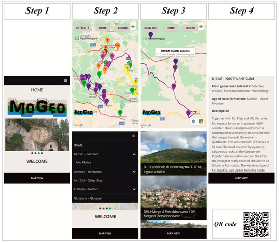 The main structure of the MoGeo App. Step 1: the Homepage that addresses to the two types of data access; Step 2: the interactive map and the drop-down menu access; Step 3: the opening of a pop-up after clicking a site on the interactive map, and the opening of a specific list of sites by selecting a single content from the drop-down menu; Step 4: the information card of a geosite. The figure contains also the QR code to download the MoGeo App.