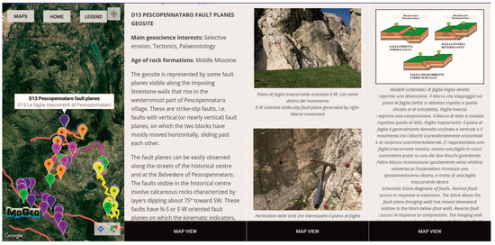 The content Geosites includes a general presentation and the information cards prepared for the 14 geosites. The presentation card (Figure 5) provides basic notions about the meaning of the term geosite and a short information on the Alto Molise geosites. The information cards provide information about the origin, geological-geomorphological features, and main geoscience interests of the geosite, as well as about the age of rock formations involved. All cards are enriched with illustrations, especially photos (Figure 5), geological sections and 3D schemes. The latter have been included mainly to explain some specific geological features such as various types of faults (Figure 5).