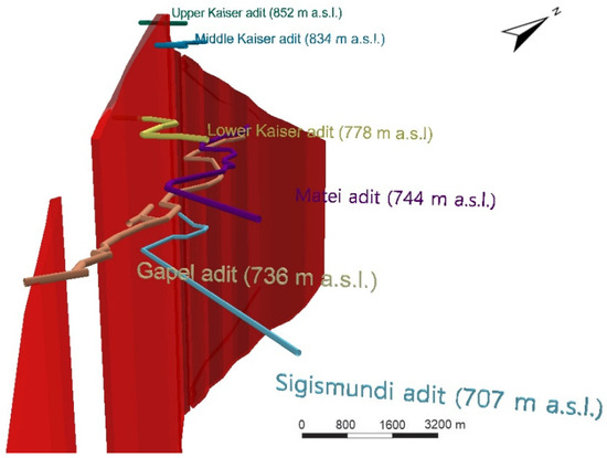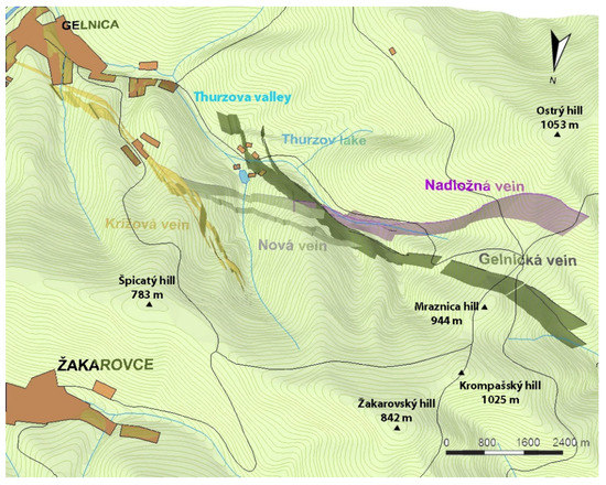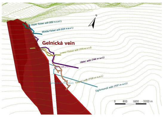 51]. After georeferencing, the individual maps from different provenances (mainly archival manuscripts of ore veins maps) had been mutually translated (ensuring an overlap of identical parts), allowing us to obtain a complete digital map of four ore veins around Gelnica.