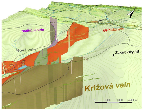 Since the model was not created for professional use in geological surveys and given the diversity of the underlying archive sources, we had to adopt a small number of simplifications in the 3D model of the four ore veins. Ore veins had to be simplified to plate bodies in terms of their spatial characteristics. Digging depth of each vein is only estimated and may vary in reality in 250 m range (depending on the data from the last exploratory wells). Ore veins enter the surface in places where pings, dumping fields, and portals of old adits are found. Each vein is characterized by its inclination. All Gelnica veins are characterized by steep or very steep inclination in the range between 60–90°. Since the ArcGIS solution for modeling of the real inclination of veins is very difficult, we have decided to consider all veins as vertical, with an inclination of 90°. The actual course of the veins is documented in two horizontal layers at 340 and 560 m above sea level [