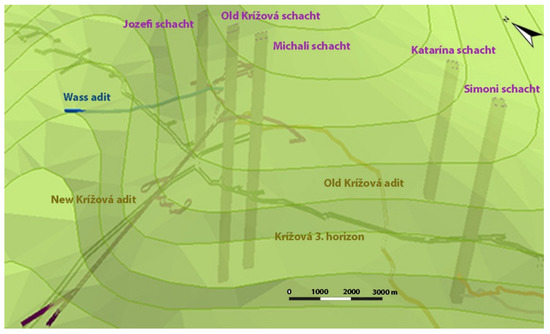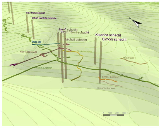 The individual mining horizons (adits) were digitized using the ArcGIS software application; in order to be able to work with them further, each horizon had been assigned one layer.