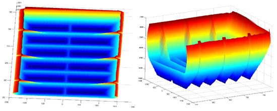 A laser scanner can be used to estimate the distance to a surface within its field of view. The transverse laser scanner (relative to the rail line) provides a series of 2D cross-sectional scans that provide a detailed view of the interior of the coal wagons (Figure 3). Because of the movement of the train, multiple scans can be accumulated to develop a three-dimensional profile of the wagon (Figure 4). If a wagon passes under a scanner and the wagon’s instantaneous speed is known, then the wagon’s interior volume can be estimated. Two scanners were mounted at the dump station as shown in Figure 2. The second scanner is used for wagon speed estimation.